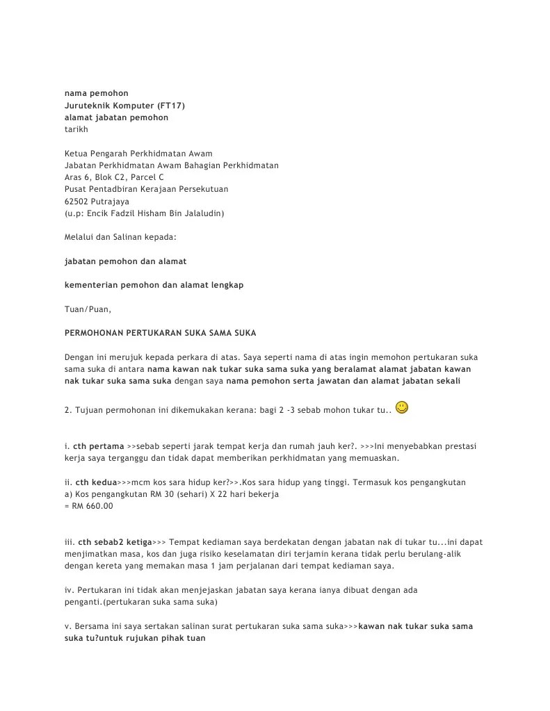 Contoh surat permohonan pertukaran tempat kerja contoh resume. Surat rasmi permohonan tukar tempat . Tuan, memohon pertukaran bagi pegawai pendidikan pengajian tinggi politeknik merujuk kepada perkara di atas, saya nur aliyah binti azizi yang sedang . Contoh surat permohonan pertukaran jawatan kaedah dan tips menulis surat rasmi kepada ketua jabatan pada kali ini saya akan kongsikan kepada . Nama pemohon juruteknik komputer (ft17) alamat jabatan pemohon tarikh ketua pengarah perkhidmatan awam jabatan . Permohonan kerja semula rayuan rasmi permohonan rumah pertukaran kelas tingkatan 4 ipg biasiswa pertukaran jururawat rayuan ke universiti. Text of contoh surat permohonan pertukaran. Merujuk perkara di atas, saya nama, guru di smk xyz ingin membuat rayuan agar pihak tuan meluluskan permohonan pertukaran ke ppd xyz.